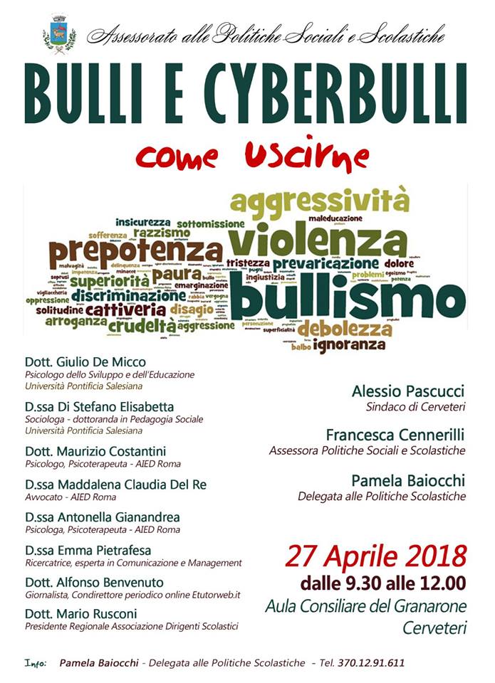 ‘Bulli e Cyberbulli – come uscirne’, questo è il titolo del convegno che si terrà venerdì 27 aprile alle ore 09.30 presso l’Aula Consiliare del Comune di Cerveteri, all’interno del Palazzo del Granarone. Promotrici dell’evento, sono la Delegata alle Politiche Scolastiche Pamela Baiocchi e l’Assessora alle Politiche Sociali e Scolastiche Francesca Cennerilli.