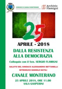 MercoledΓ¬ 25 aprile alle ore 11, presso la Sala Gasperini di Canale Monterano si celebra l’anniversario della Liberazione insieme al senatore Sergio Flamigni. “Dalla Resistenza alla Democrazia”, un percorso fatto di testimonianze. La mattina sarΓ introdotta dal saluto del sindaco di Canale Monterano, Alessandro Bettarelli e dalla presentazione del dottor Daniele Natili.