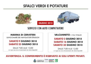 Confermato anche per il mese di giugno il servizio di auto-compattatore per il conferimento nelle Frazioni di Valcanneto e Marina di Cerveteri di sfalci verdi e potature di giardino.