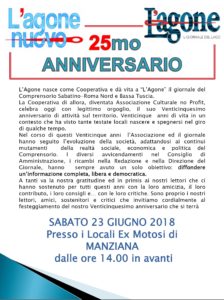 LβAgone nasce come Cooperativa e dΓ vita a βLβAgoneβ il giornale del Comprensorio Sabatino-Roma Nord e Bassa Tuscia. La Cooperativa di allora, diventata Associazione Culturale no Profit, celebra oggi con legittimo orgoglio, il suo Venticinquesimo anniversario di attivitΓ sul territorio. Venticinque anni di vita in un contesto che ha visto tante testate locali nascere e spegnersi nel giro di qualche tempo. Nel corso di questi Venticinque anni lβAssociazione ed il giornale hanno seguito lβevoluzione della societΓ , adattandosi ai continui mutamenti della realtΓ sociale, economica e politica del Comprensorio. I diversi avvicendamenti nel Consiglio di Amministrazione, i ricambi nella Redazione e nella Direzione del Giornale, hanno sempre avuto un solo obiettivo: diffondere unβinformazione completa, libera e democratica. A tanti va la nostra gratitudine ed in primis ai nostri lettori che ci hanno sostenuto per tutti questi anni con la loro amicizia, il loro contributo, i loro consigli eβ¦ con le loro critiche. Sono proprio i nostri lettori, amici, sostenitori e critici che invitiamo cordialmente al festeggiamento del nostro Venticinquesimo anniversario che si terrΓ SABATO 23 GIUGNO 2018 Presso i Locali Ex Motosi di MANZIANA dalle ore 14.00 in avanti. Per gli interessatiΒ l’ingresso ex Motosi (Manziana) Γ¨ in Via Lazio, 2 (casetta dei prodotti tipici) sulla strada dell’aeroporto Savini (20m a destra).