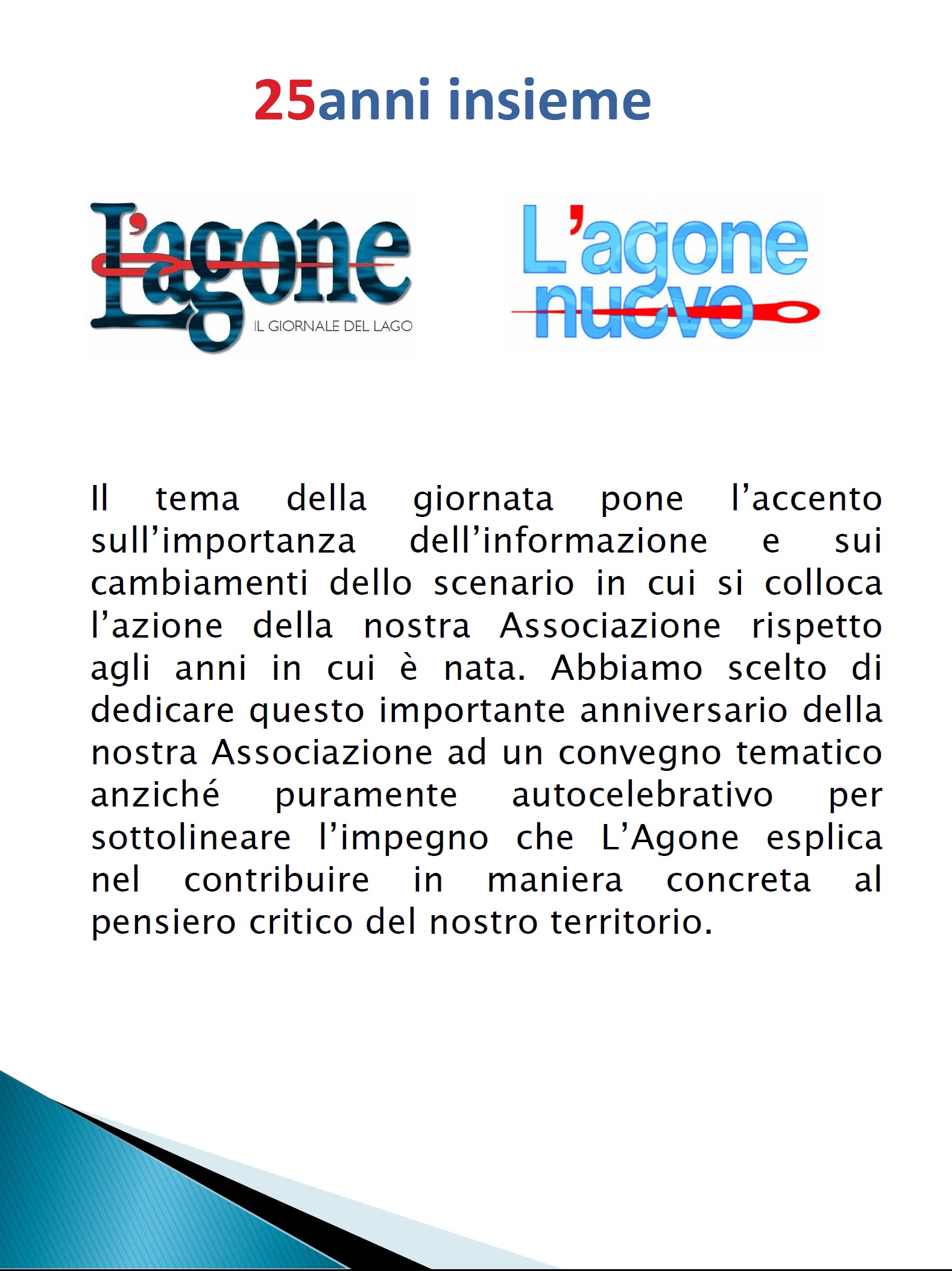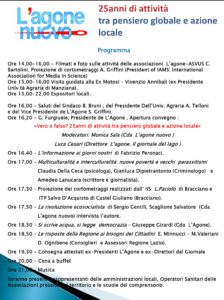 dedicare questo importante anniversario della nostra Associazione ad un convegno tematico anzichΓ© puramente autocelebrativo per sottolineare lβimpegno che LβAgone esplica nel contribuire in maniera concreta al pensiero critico del nostro territorio.