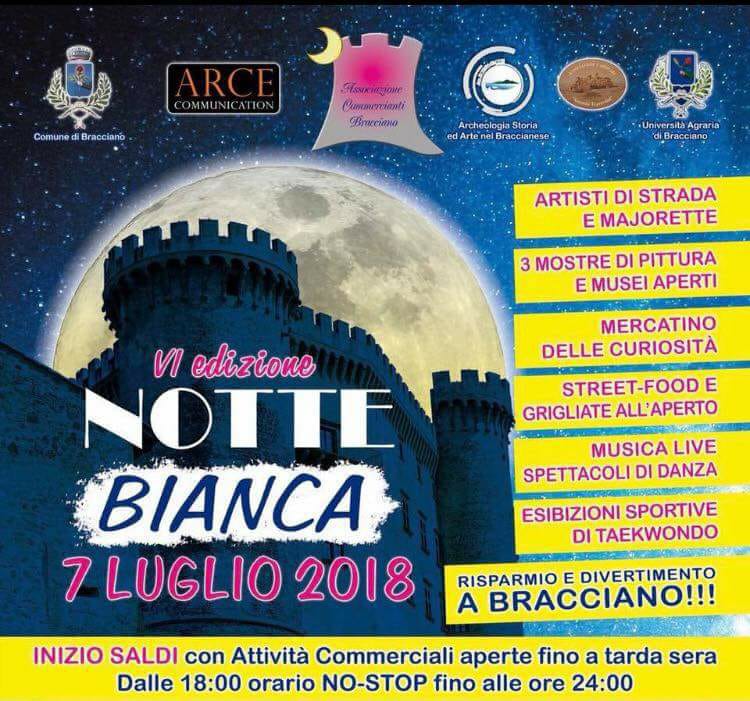 Bracciano si prepara a vivere la sua Notte Bianca, il prossimo sabato 7 luglio. Giunto alla sua sesta edizione , l’evento è organizzato dall’ Associazione Commercianti di Bracciano ed è quello che ormai più di ogni altro riesce a richiamare il maggior numero di cittadini e turisti. A partire dal tardo pomeriggio di sabato le strade del centro cittadino diventeranno una grande isola pedonale; infatti saranno chiuse al traffico il tratto basso di via principe di Napoli, via Traversini, via Umberto I e piazza Mazzini. Le automobili lasceranno il posto ai tavoli di bar e ristoranti, che consentiranno di intrattenersi all’aria aperta, gustando piatti locali. A far da cornice ad eventi gastronomici, mercatini e negozi aperti. Non solo cibo e shopping durante la Notte Bianca, ma anche e soprattutto arte e tradizione, con l’apertura straordinaria dei musei, in particolare sarà visitabile il Museo dell’Opera del Duomo, in via della Collegiata, dove a partire dalle 21.00 sarà possibile fare un affascinante viaggio nella storia e nell’arte di Bracciano, ammirando la pala del Santissimo Salvatore e tante altre opere di pregio. A rendere piacevoli le passeggiate per le strade di Bracciano concerti ed eventi musicali, giochi e tanti altri intrattenimenti.