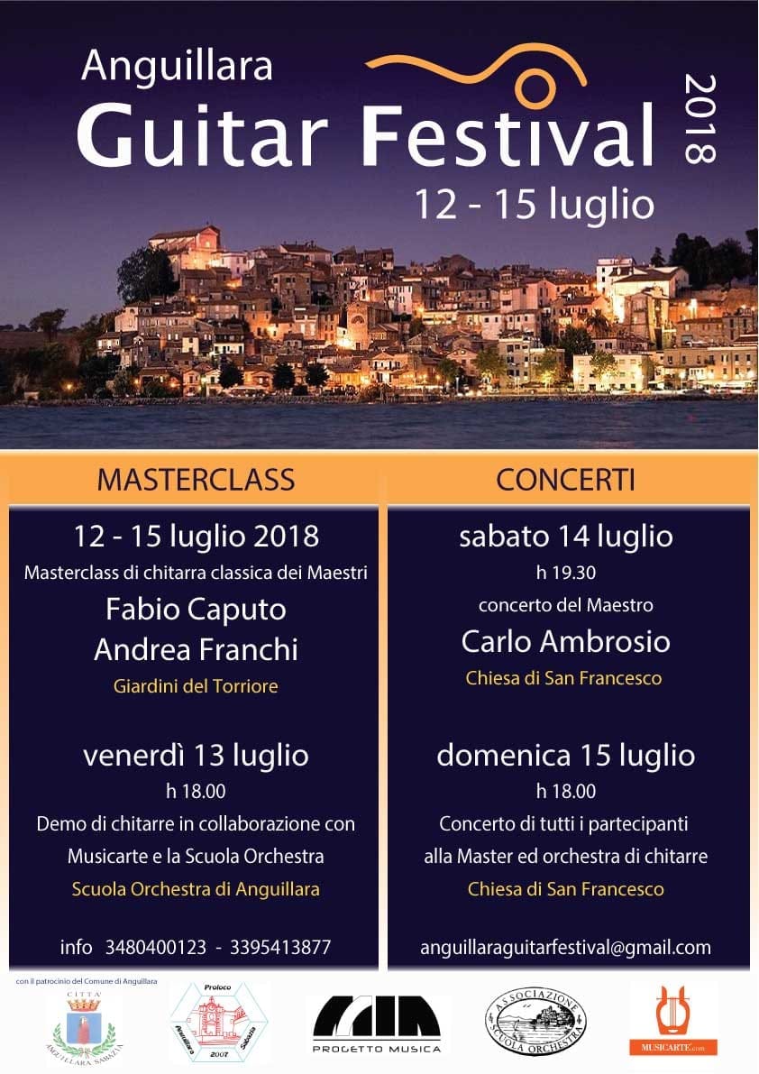 Il Festival, con il patrocinio del Comune di Anguillara e con la collaborazione della Proloco, organizzato dai Maestri Andrea Franchi e Fabio Caputo, partirà con una Masterclass ai Giardini del Torrione e proseguirà con un demo di chitarre in collaborazione con Musicarte e con la Scuola Orchestra.