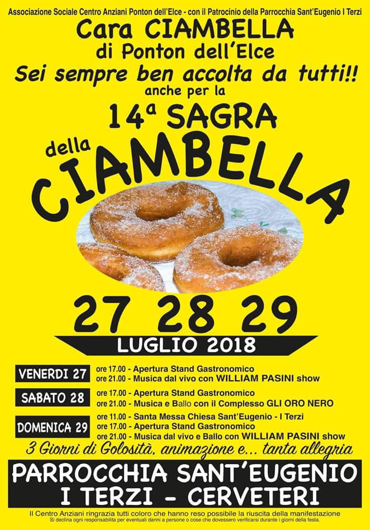Un finesettimana all’insegna delle golosità nella Frazione di Cerveteri del Borgo de I Terzi. L’Associazione Sociale Centro Anziani Ponton dell’Elce, in collaborazione con la Parrocchia Sant’Eugenio de I Terzi ed il patrocinio dell’Assessorato alle Politiche culturali del Comune di Cerveteri organizzano la 14^ Sagra della Ciambella. Venerdì 27, sabato 28 e domenica 29 luglio un ricco programma di iniziative, con concerti, spettacoli di ballo e, ogni giorno, a partire dalle ore 17.00, stand gastronomici dove poter gustare le più prelibate leccornie.