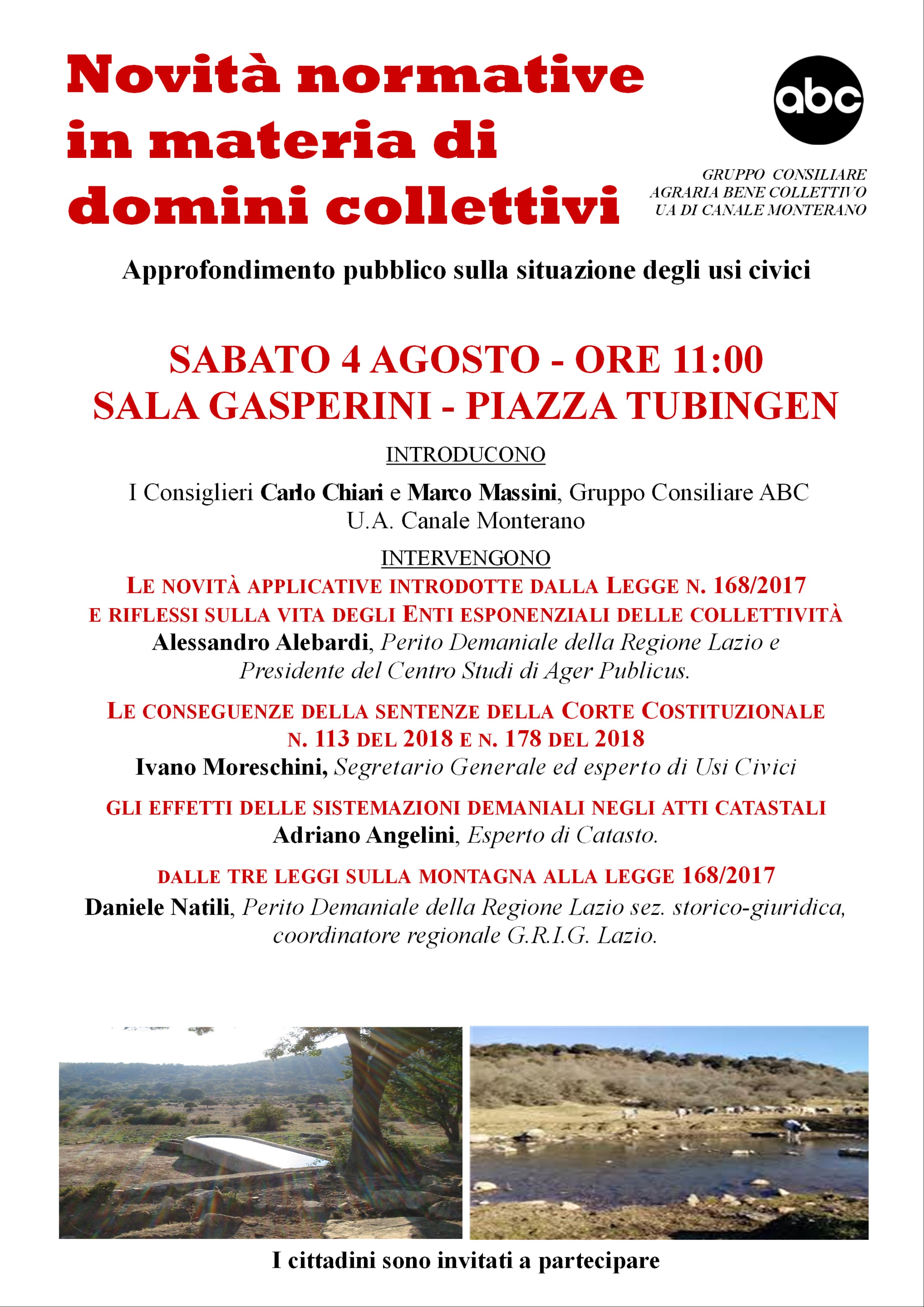 Si terrà Sabato 4 Agosto alle ore 11,00 presso la Sala Gasperini a piazza Tubingen a Canale Monterano un incontro aperto al pubblico sulle novità normativa in materia di domini collettivi.