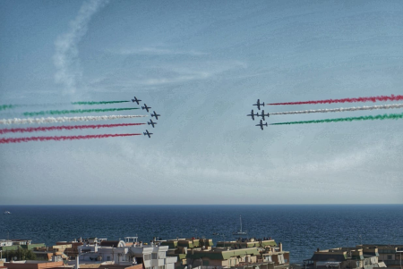 Cielo tricolore a Ladispoli per l’esibizione spettacolare della Pattuglia Acrobatica Nazionale: domenica 29 luglio gli aerei dell’Aeronautica Militare Italiana hanno sorvolato il litorale laziale all’altezza della spiaggia di Palo, salutando i cittadini in un crescendo di spettacolarità e di emozioni, con i volteggi artistici che li hanno resi celebri in tutto il mondo. A svolgere il servizio di accoglienza per gli ospiti della Tribuna d’Onore, c’erano gli studenti dell’Istituto Alberghiero di Ladispoli (Indirizzo Accoglienza Turistica), coordinati dai loro docenti Karin Bedini e Carmen Piccolo (Referenti rispettivamente della Commissione Eventi, Orientamento e Alternanza Scuola-Lavoro).