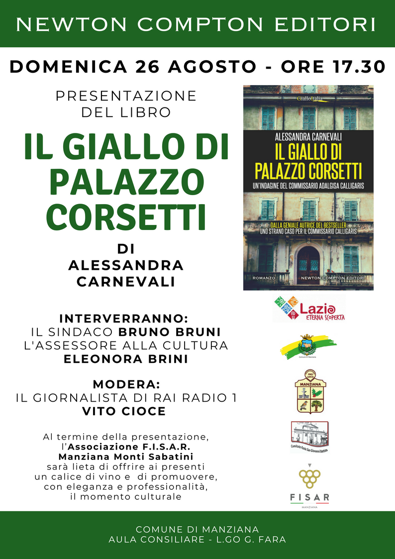 Manziana: nell’ambito dei festeggiamenti del Santo Patrono San Giovanni Battista , la scrittrice Alessandra Carnevali domenica 26 agosto 2018 ore 17.30 presso l’Aula Consiliare del Comune di Manziana – presenta il suo libro “Il giallo di Palazzo Corsetti” Newton Compton Editori, modera il giornalista di Radio 1 Rai Vito Cioce.Interverranno il Sindaco Bruno Bruni e l’Assessore alla Cultura Eleonora Brini.
