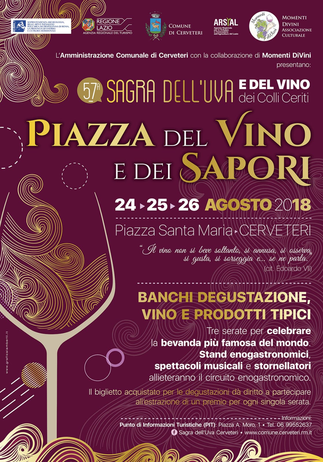 Ma Piazza Santa Maria non sarà solo teatro per le cantine di Cerveteri per promuovere il vino e l’uva. Come tradizione, riservato all’interno del programma, ampio spazio alla cultura e alle visite guidate al Patrimonio archeologico di Cerveteri. Ogni sera, dalle ore 21.00, apertura straordinaria della Mostra allestita nei locali di Case Grifoni ‘I Capolavori Ritrovati’. Sabato 25 agosto a sera, la Necropoli Etrusca della Banditaccia aprirà le porte a turisti e visitatori alla riscoperta dell’Area dei Grandi Tumuli, mentre domenica 26, alle ore 10.30, visita guidata al Museo Nazionale Cerite e ai due Capolavori di Eufronio, la Kylix e il Cratere.