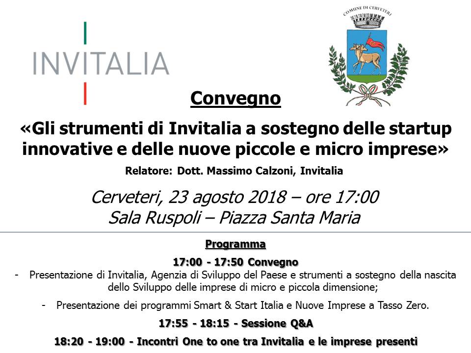 Gli strumenti di Invitalia a sostegno delle startup innovative e delle nuove piccole e micro imprese”, è questo il titolo del convegno promosso da INVITALIA, Agenzia leader in Italia per l’attrazione degli investimenti e lo sviluppo d’impresa, di proprietà del Ministero dell’Economia, che si svolgerà domani, giovedì 23 agosto alle ore 17.00 nei locali di Sala Giovanni Ruspoli in Piazza Santa Maria a Cerveteri.