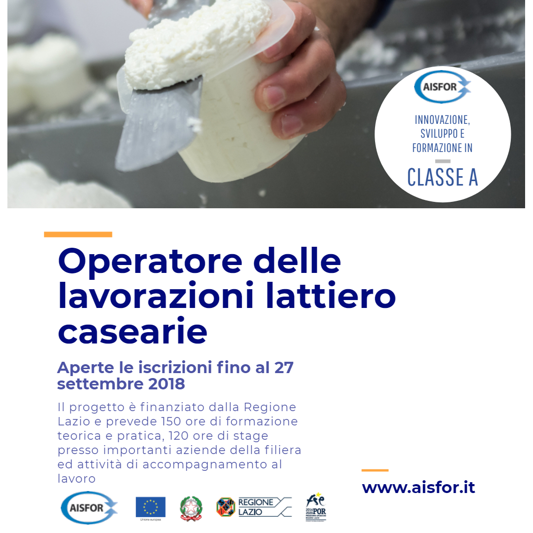 Il corso “Operatore delle lavorazioni lattiero casearie” organizzato da Aisfor è approvato e finanziato dalla Regione Lazio e mira a formare 15 figure professionali su alcune abilità specifiche del mestiere di caseificatore.