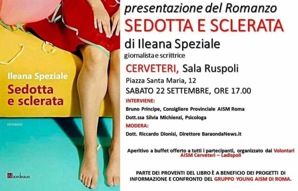 “La presentazione del libro di Ileana – spiegano i Volontari AISM di Cerveteri – è inserita all’interno delle iniziative promosse anche nel nostro territorio per i ‘50anni di AISM – Associazione Italiana Sclerosi Multipla Italiana’, che vedrà tra l’altro gli interventi del Consigliere Provinciale AISM Roma Bruno Principe, della Psicologa Dott.ssa Silvia Michienzi, e del Direttore del quotidiano online Baraondanews.it Dott. Riccardo Dionisi, che modererà l’incontro.