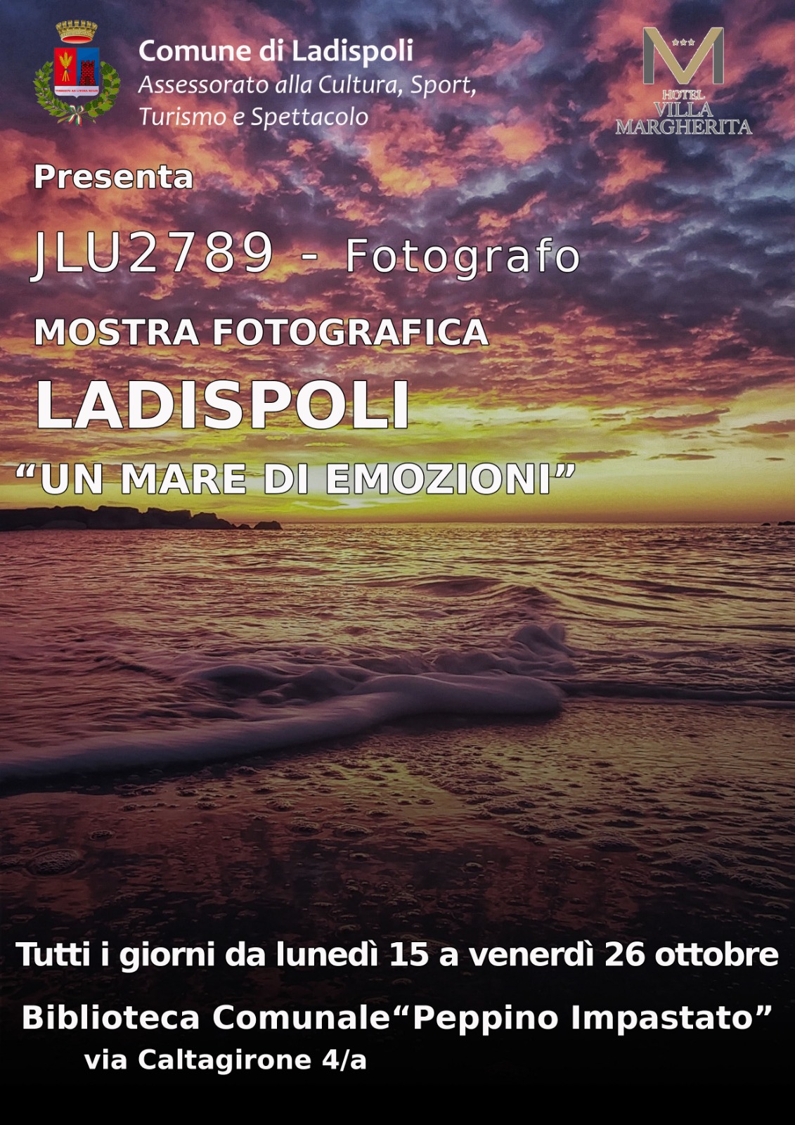 L’amministrazione comunale informa che verrà inaugurata lunedì 15 ottobre alle ore 17 la mostra fotografica “Ladispoli. Un mare di emozioni” patrocinata dall’Assessorato alla Cultura e realizzata in collaborazione con il fotografo JLU2789, una serie di scatti dedicati al nostro mare.