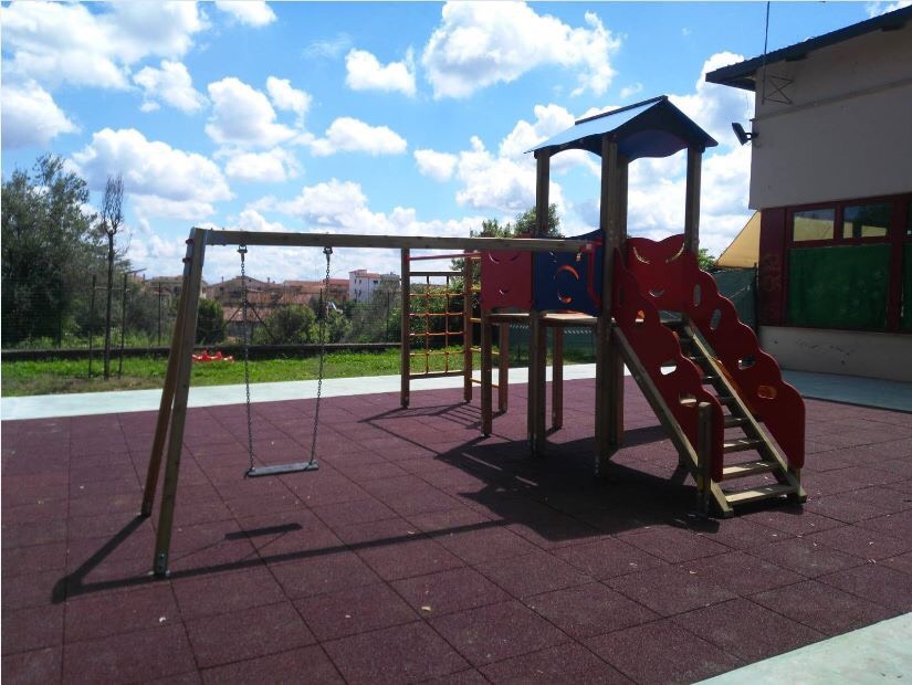 Completamente disfatta la vecchia e pericolosa struttura che presentava pericolosi ferri sporgenti e il pavimento antitrauma collassato da parecchio tempo, la nuova struttura di cemento stampato vede applicato una nuova pavimentazione antitrauma di 7 cm di spessore adeguata alle altezze del nuovissimo gioco montato al centro con scivoli e giochi vari.
