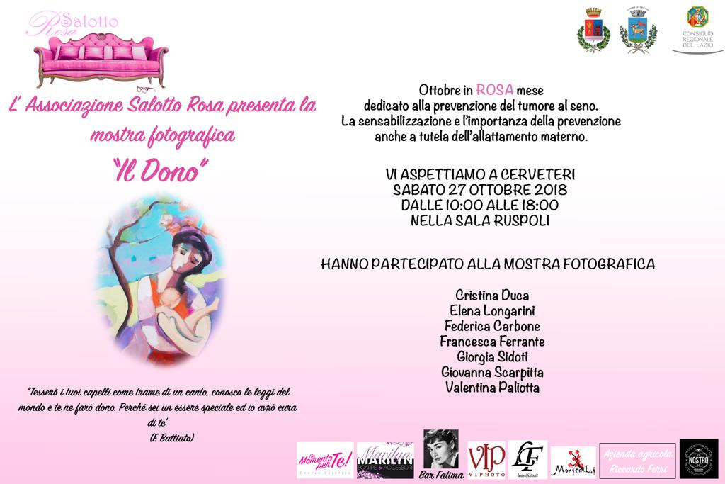 Anche quest’anno torna Ottobre rosa la campagna di prevenzione del tumore al seno della Regione Lazio. Per l’occasione, a Cerveteri, l’Associazione culturale Salotto Rosa presenta la mostra fotografica ‘Il Dono’, che vedrà protagoniste con l’esposizione dei loro scatti più significativi e rappresentativi, Cristina Duca, Elena Longarini, Federica Carbone, Francesca Ferrante, Giorgia Sidoti, Giovanna Scarpitta e Valentina Paliotta.