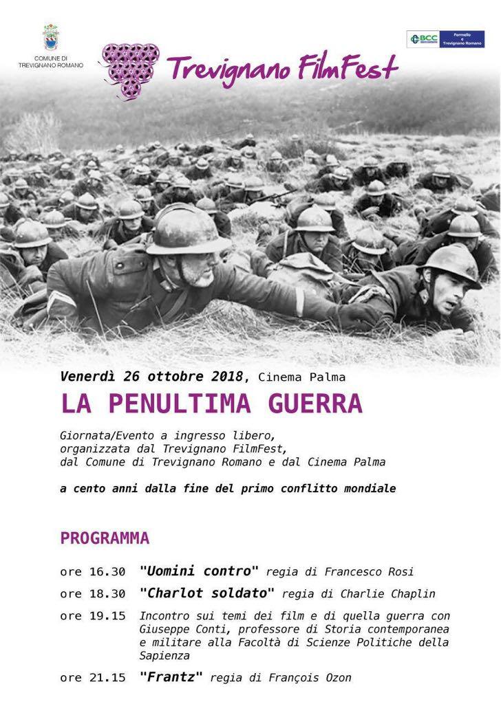 A cento anni dal primo conflitto mondiale il prossimo venerdì 26 Ottobre si terrà una giornata a ingresso libero presso il Cinema Palma. L’evento comincerà alle 16:30 con la proiezione di “Uomini contro” del regista Francesco Rosi; alle 18:30 sarà la volta di “Charlot il soldato” regia di Charlie Chaplin. Subito dopo la proiezione, alle 19:15 si terrà un incontro incentrato sulle tematiche dei film visti, e quindi della guerra, con Giuseppe Conti, professore di Storia contemporanea e militare alla facoltà di Scienze Politiche della Sapienza. La giornata si concluderà alle 21:15 con la proiezione di “Frantz” del regista François Ozon.