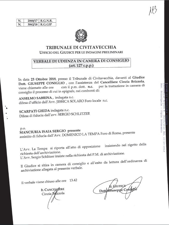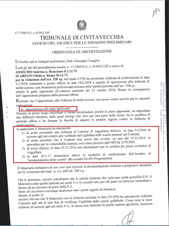 Non corrisponde a verità quanto dichiarato dal geom. Manciuria che “i presupposti per la prosecuzione delle indagini contenute nei capi 1 e 3 avrebbero potuto perfezionarsi solo attraverso una formale messa in mora per non aver risposto nei termini” poiché il Giudice per il punto 1 scrive “…..Non solo, nel caso di specie il Manciuria ha anche ricevuto una risposta, con la quale l’Arch. Scarpati (allora Responsabile Area Tecnica del Comune di Anguillara Sabazia – n.d.r.) lo informava che la richiesta era in fase di istruttoria, comunicando in tal modo, sia la presa in carico dell’istanza, sia l’impossibilità oggettiva di rispondere nell’immediatezza alla stessa”.