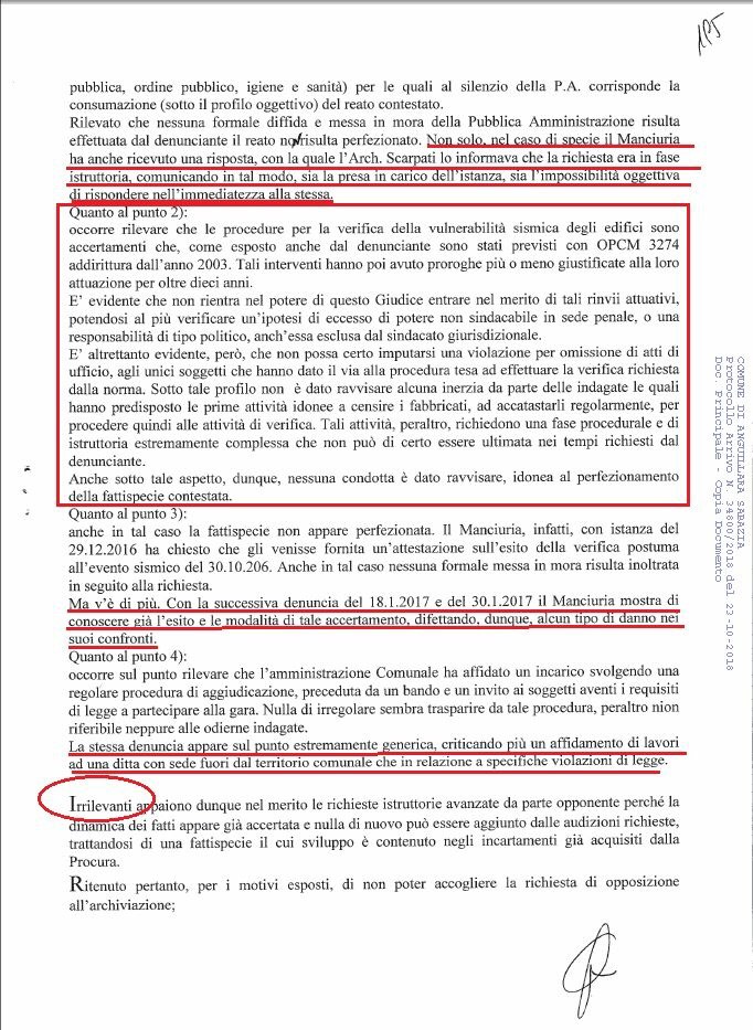per il punto 2) il Manciuria denunciava “di avere accertato che il Comune non aveva mai avviato –se non dal 13.12.2016- le procedure per la vulnerabilità sismica, così come previsto dall’OPCM 3274 dell’anno 2003”. Anche qui, senza entrare nel merito delle presenze del Manciuria nelle amministrazioni comunali degli ultimi 15 anni e quindi accortosi incredibilmente solo nel 2016, dopo aver perso la poltrona in consiglio comunale che dal 2003 nessuna amministrazione di Centrodestra o Centrosinistra aveva mai avviato tali procedure di legge, il Giudice legna forte specificando: “…E’ altrettanto evidente, però, che non possa certo imputarsi una violazione per omissione di atti di ufficio, agli unici soggetti che hanno dato il via alla procedura tesa ad effettuare la verifica richiesta dalla norma. Sotto tale profilo non è dato ravvisare alcuna inerzia da parte delle indagate le quali hanno predisposto le prime attività idonee a censire i fabbricati, ad accatastarli regolarmente, per procedere quindi alle attività di verifica. Tali attività, peraltro, richiedono una fase procedurale e di istruttoria estremamente complessa che non può di certo essere ultimata nei tempi richiesti dal denunciante (Manciuria – ndr)”.