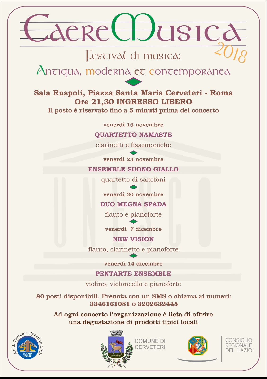 ‘Caere Musica 2018’ prosegue a Dicembre con due appuntamenti: venerdì 7 si esibiranno i ‘New Vision’, con sinfonie al flauto, clarinetto e pianoforte. Chiudono la rassegna, venerdì 14 dicembre, i ‘Pentarte Ensemble’ con un concerto violino, violoncello e pianoforte.
