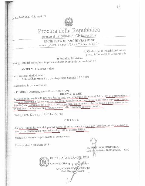 NESSUNA DIFFAMAZIONE DA PARTE DELL’AMMINISTRAZIONE 5 STELLE DI ANGUILLARA SABAZIA NEI CONFRONTI DEL CONSIGLIERE FIORONI IN MERITO AL COMUNICATO DEL 7/7/2018 CHE SEGUIVA AL SUO PASSAGGIO ALL’OPPOSIZIONE IN CONSIGLIO COMUNALE – LO HA STABILITO LA PROCURA DELLA REPUBBLICA