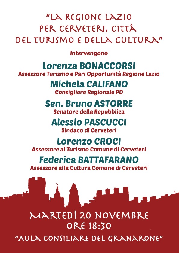 “La Regione Lazio per Cerveteri, città del turismo e della cultura”. Questo il titolo del convegno che avrà luogo a Cerveteri martedì 20 novembre alle ore 18.30 presso l’Aula Consiliare del Granarone.