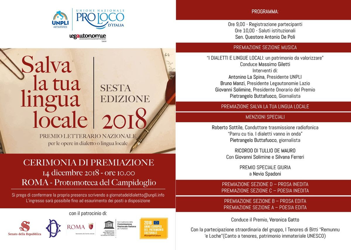 La Giuria del Premio Nazionale “Salva la tua lingua locale” ha decretato i vincitori della sesta edizione 2018.