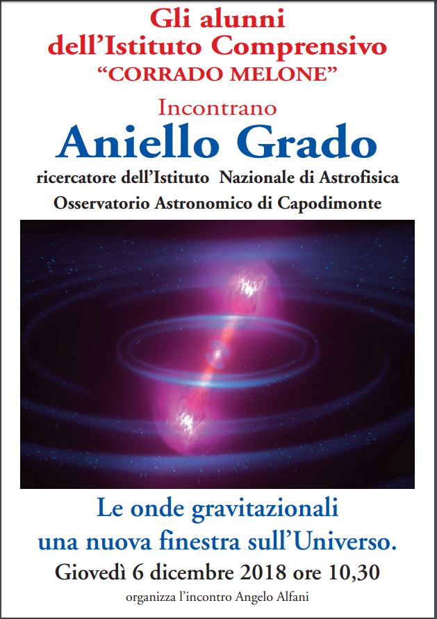 Il prossimo giovedì 6 novembre, gli studenti della “Corrado Melone” incontreranno il dott. Aniello Grado, ricercatore dell’ Istituto Nazionale di Astrofisica – Osservatorio Astronomico di Capodimonte che parlerà di “Onde gravitazionali: una nuova finestra sull’Universo”.