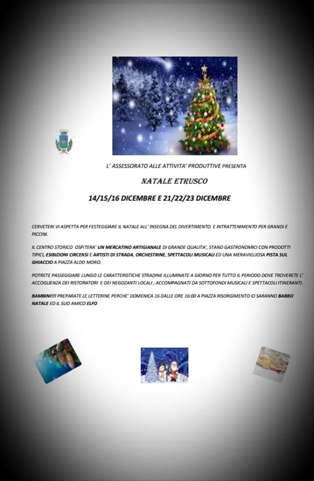 Dopo il successo dell’esordio in Piazza Morbidelli a Marina di Cerveteri, il Natale Etrusco 2018 arriva nel Centro Storico di Cerveteri. Sabato 15 e domenica 16 dicembre, per l’intera giornata spettacoli di magia, animazione, artisti circensi, stand gastronomici, giocolieri e un mercatino di artigianato di alta qualità, ricercato ed estremamente vario: questi gli ingredienti della due giorni messa a punto da Luciano Ridolfi, Assessore alle Attività Produttive e Sviluppo Economico del Comune di Cerveteri.