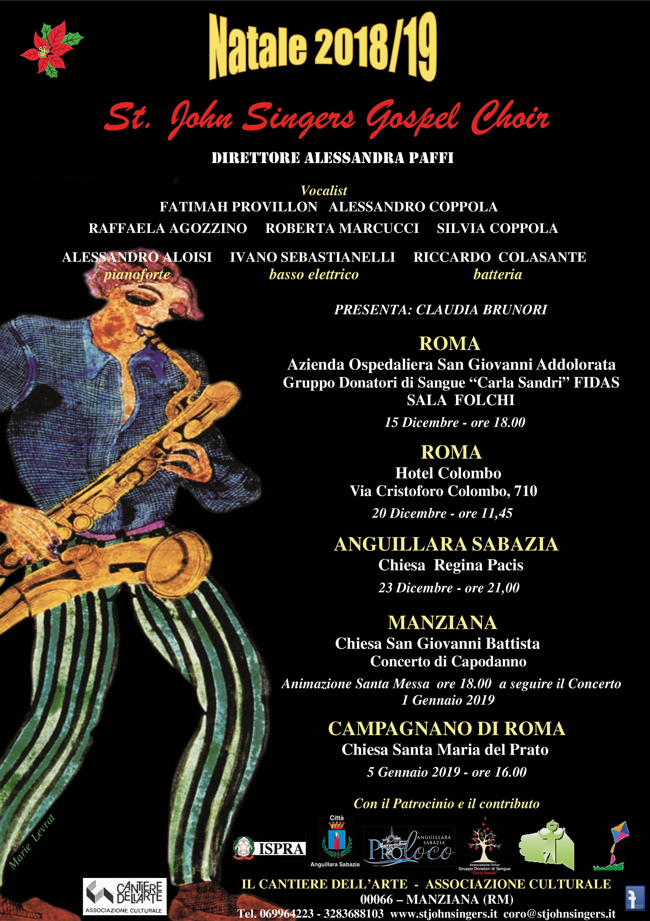 I concerti vedranno esibirsi, per la direzione di Alessandra Paffi, i St John’s Sigers accompagnati dal pianista Alessandro Aloisi, dal bassista Ivano Sebastianelli e dal batterista Riccardo Colasante. Vocalist: Fatimah Provillon, (Si esibirà nel Concerto di Manziana ). Solisti: Raffaella Agozzino, Roberta Marcucci, Alessandro Coppola, Silvia Coppola.