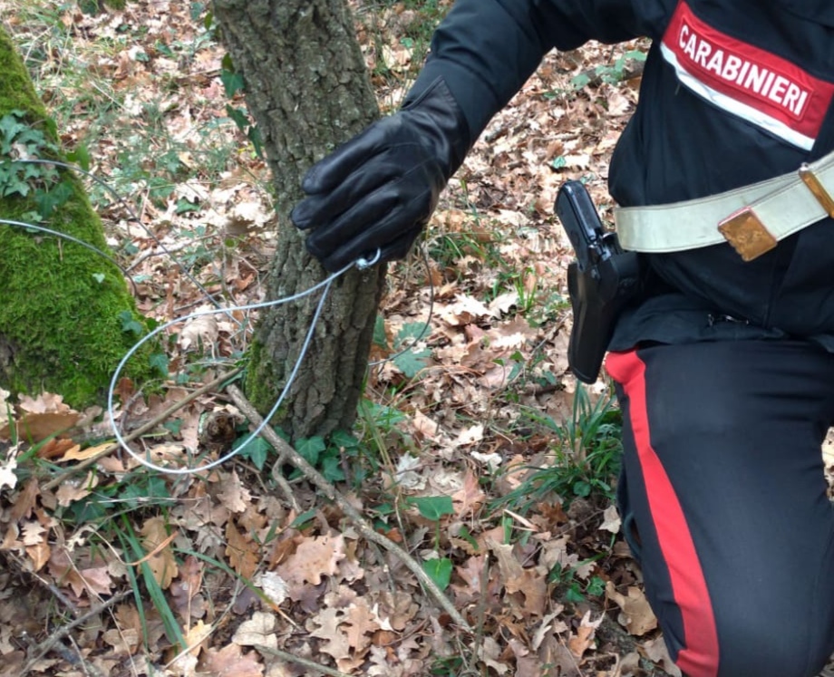 Al termine della successiva perquisizione presso l’abitazione dell’uomo, i militari hanno rinvenuto e sequestrato un altro laccio metallico ed un fucile da caccia regolarmente detenuto.
