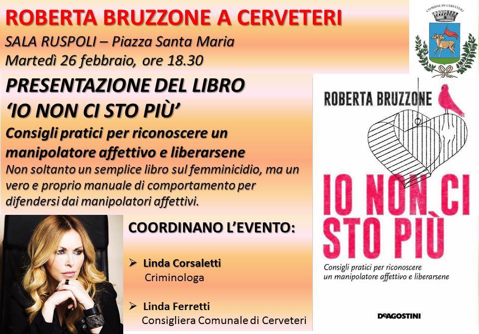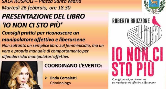 Nel salotto culturale di Sala Giovanni Ruspoli in Piazza Santa Maria a Cerveteri è pronta ad arrivare una grande ospite di fama nazionale: Roberta Bruzzone, che presenterà il suo ultimo libro dal titolo ‘Io non ci sto più – Consigli pratici per riconoscere un manipolatore affettivo e liberarsene’, edito da De Agostini.