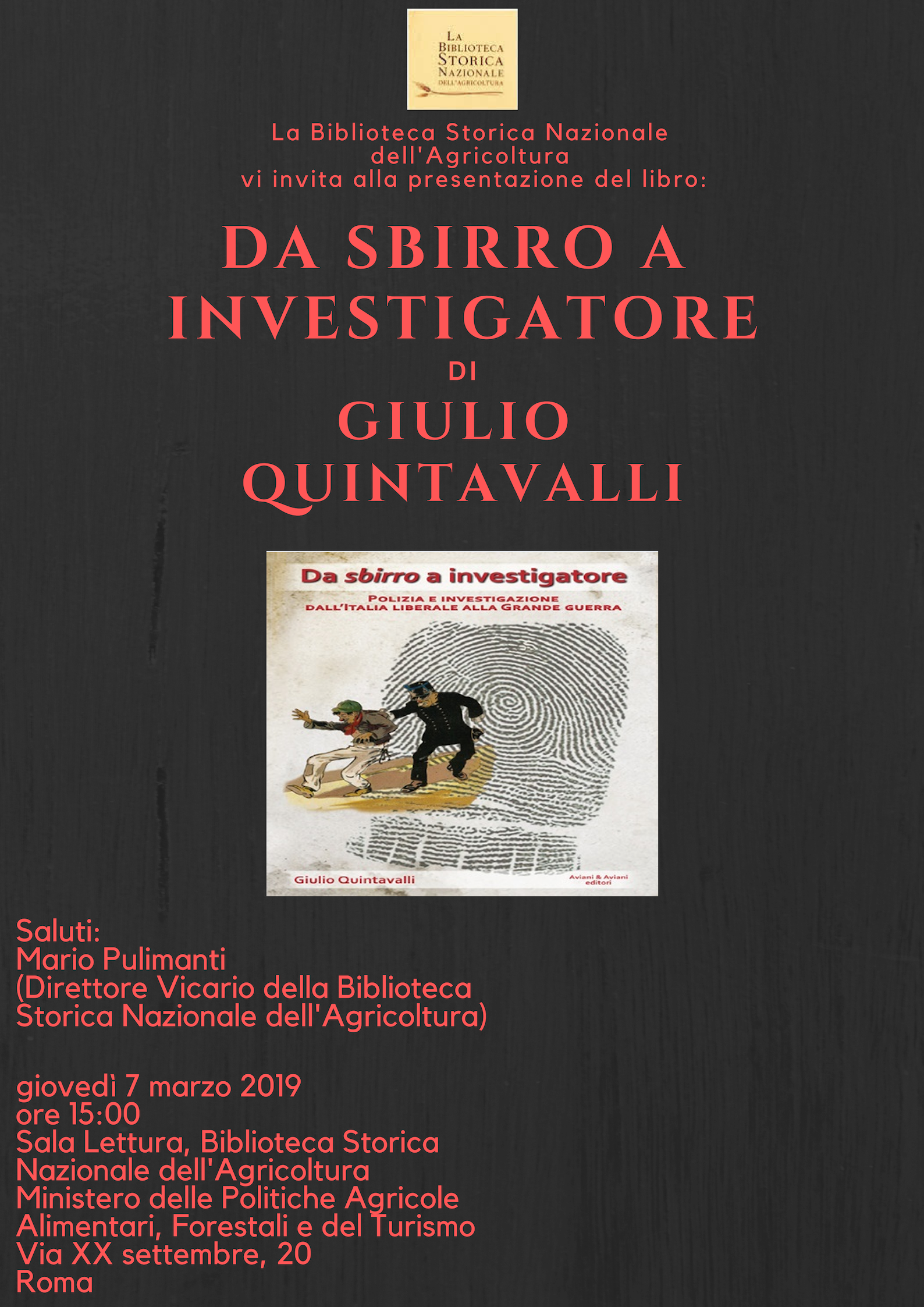 Proseguono gli eventi culturali organizzati dalla Biblioteca Storica Nazionale dell’Agricoltura: presentazione del volume “Da sbirro a investigatore. Polizia e investigazione dall’Italia liberale alla Grande guerra” dell’Ispettore di Polizia, lo Storico dott. Giulio Quintavalli