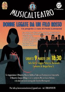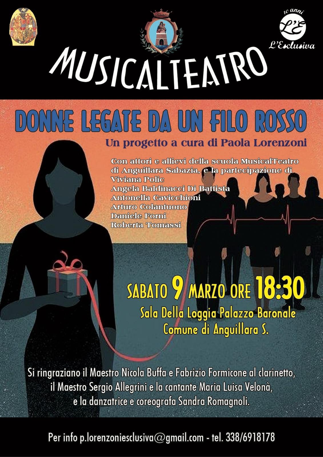 Quindi sabato 9, alle ore 18.30, presso il loggiato del Palazzo Orsini, a cura dell’Associazione L’Esclusiva presieduta da Paola Lorenzoni affiancata dal Maestro Nicola Buffa e da altri Maestri, tra cui il Maestro Sergio Allegrini, vi sara’ un esperimento di Musicalteatro, per la prima volta nella pregevole loggia cinquecentesca affrescata dalla Scuola di Raffaello. Il titolo e’ “Donne legate da un filo rosso”, un progetto teatrale nato dal desiderio di Paola Lorenzoni, di far vivere all’interno della meravigliosa sala della Loggia del Palazzo Baronale in piazza del Comune di Anguillara Sabazia, la magia degli affreschi con la bellezza della danza, del canto, e del suono, in una tessitura con racconti poetici di personaggi archetipi della mitologia e del teatro. Con Penelope che passa ad Arianna nel labirinto il filo rosso, simbolo di legami, di sangue, di passione, di trama e di ordito, si passa al racconto di Amleto, e poi di Otello, di Iago, e poi di Cassandra. Per tornare a Penelope che tesse la tela, fino a trovare la leggerezza di Ariel che gioca e vola con il filo della speranza.