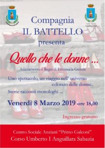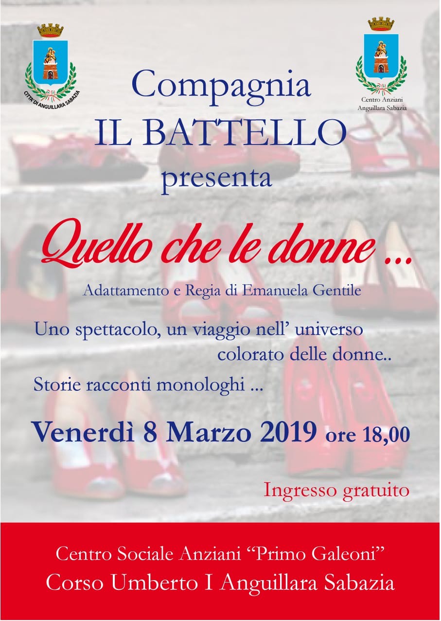 Si parte il venerdi sera proprio l’8 marzo, nel cuore del centro storico, presso il Centro Anziani Primo Galeoni, su corso Umberto I, alle ore 18.00, con la piece teatrale e non solo, dal titolo “Quello che le donne 2019 – quinta edizione, promossa dalla Compagnia Teatrale “Il Battello”, in collaborazione con Centro Anziani e con gli Assessorati agli Eventi e alle Politiche Sociali e alla Cultura. Un viaggio lungo il quale donne raccontano altre donne, un omaggio all’otto marzo e al femmineo. Piu’ che uno spettacolo e’ un incontro, un’occasione per riflettere sul momento storico in cui viviamo e sul ruolo attuale della donna. Tra gli interventi previsti: Manuela Maggi, Agente della Polizia di Stato sul tema del femmicidio; Laura Cavalli Scienze olostiche e benessere apitetapia e cosmesi; a seguire le attrici Viviana Polic, Carla Maglione, Angela Baldinacci Di Battista, Rita Jacoponi, Simona Romagnoli, Manuela Gentili, eseguiranno appassionati monologhi. L’idea e l’ottimizzazione, dopo il grande successo della recente rassegna teatrale nel centro storico, e’ di Emanuela Gentile.