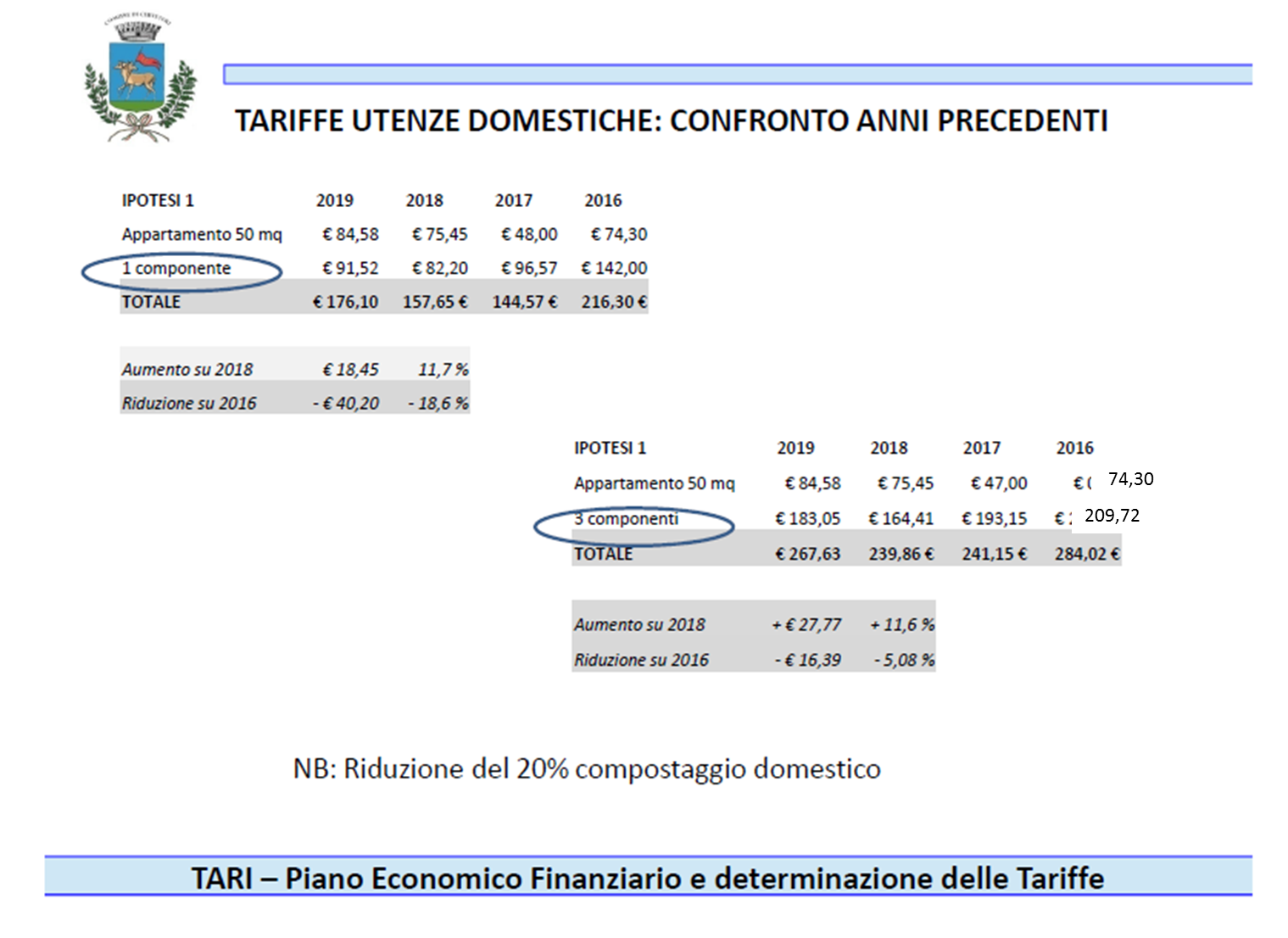 “I dati (per completezza in allegato alla presente nota) sono comunque chiari – conclude l’Assessora Gubetti – e vedono un aumento della Tari rispetto all’anno 2018, ma in netta diminuzione rispetto all’anno 2016 (anno in cui è iniziato il porta a porta). Ad esempio per una famiglia di 3 componenti in un’abitazione di 50 mq la TARI sarà di circa di 267 euro, 27 euro in più rispetto al 2018 ma comunque sempre 16 euro in meno rispetto al 2016, per una famiglia di 3 componenti in un’abitazione di 100 mq sarà invece di 350 euro circa, 36 euro in più rispetto allo scorso anno, ma ben 80 euro in meno rispetto al 2016. Ciò testimonia che se la nostra Amministrazione non avesse, con grande lungimiranza, dato avvio a questa importante rivoluzione ambientale per la nostra città, con i costi di conferimento in discarica di oggi avremmo speso cifre ben maggiori, oltre gli 8 milioni di euro, contro i 6.890.636,65 di quest’anno. Un risparmio quindi di oltre un milione di euro. Purtroppo non dipende da noi il rialzo dei costi del conferimento in discarica che ha influenzato in maniera preponderante l’aumento della Tari”.