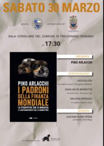 Sabato 30 Marzo ore 17,30 , alla sala consiliare di Trevignano Romano, l’autore Pino Arlacchi presenta il suo libro “I padroni della finanza mondiale”, interverranno il Vicesindaco Luca Galloni, il presidente dell’ass. Humanae Vitae ed il consigliere Regionale Emiliano Minnucci. Modera il giornalista di MicroMega Giacomo Russo Spena