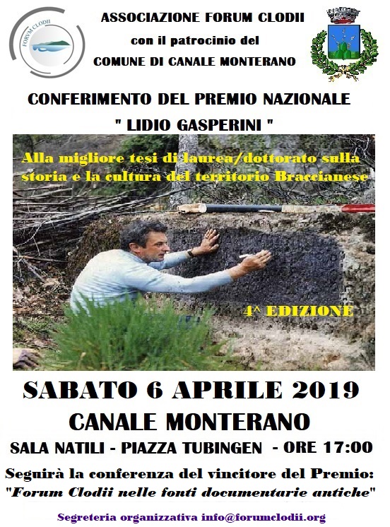 Sabato 6 aprile 2019, alle ore 17.00, in Canale Monterano, presso la sala Natili in piazza Tubinga, l’Associazione Forum Clodii , con il patrocinio del Comune di Canale Monterano, conferirà il premio Lidio Gasperini 2019 assegnato alla d.ssa Giovanna Ottavianelli per la tesi di laurea:“Forum Clodii nelle fonti documentarie antiche”.