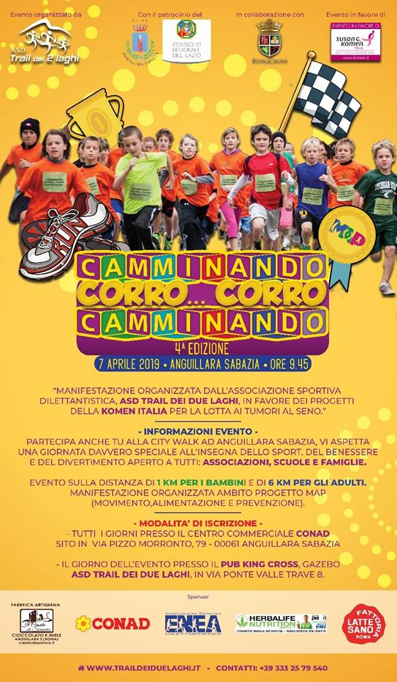 Tutto pronto per la 4° edizione della “Camminando Corro…Corro Camminando” che si terrà domenica 7 Aprile e come ogni anno rappresenta un’occasione ludico-sportiva sia per bambini che per adulti. L’evento, organizzato dall’Associazione sportiva dilettantistica ASD Trail dei Due Laghi e con il patrocinio del Comune di Anguillara S. e della Regione Lazio, contribuisce, devolvendo tutto il ricavato, ai progetti della Komen Italia per la lotta ai tumori al seno. “E’ necessario valorizzare lo sport-ci spiega Luigino Trivellini, coorganizzatore dell’evento- come veicolo di educazione alimentare, formazione e sviluppo.”