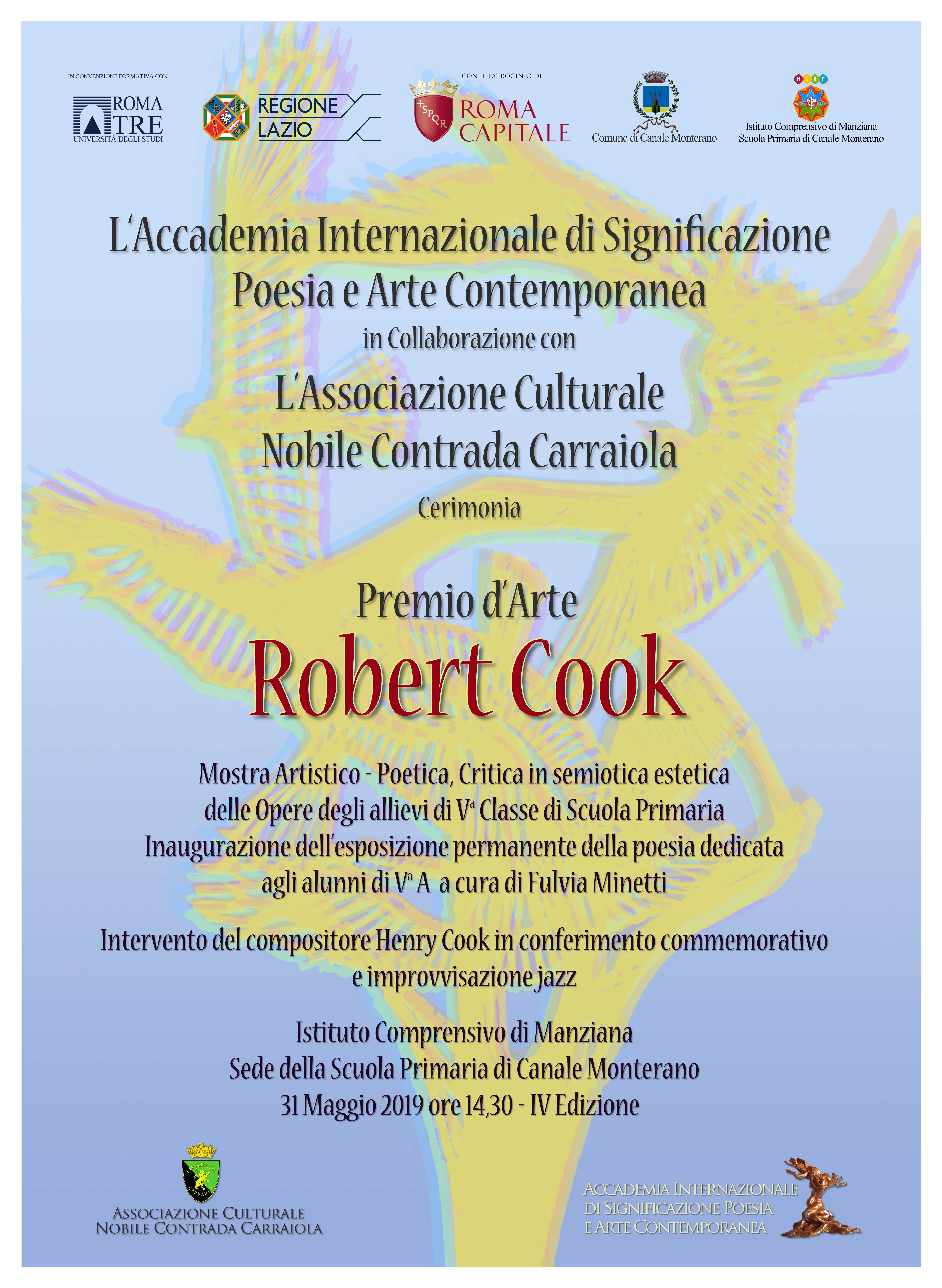 In Convenzione formativa con l’Università degli Studi di Roma Tre, con il Patrocinio della Regione Lazio, di Roma Capitale, del Comune di Canale Monterano e dell’Istituto Comprensivo di Manziana, l’Accademia Internazionale di Significazione Poesia e Arte Contemporanea, in collaborazione con l’Associazione Culturale Nobile Contrada Carraiola, cerimonia il Premio d’Arte Robert Cook con mostra artistico-letteraria dei bambini, critiche in semiotica estetica della presidenza accademica in diploma, conferimento di tre medaglie cookiane in pregiata fusione manuale in argento ed incisione pantografata del laboratorio orafo di Via Margutta, riconoscimento alla memoria di Alberto Marani, premi speciali della Contrada e dello Studio S.A.MAR e improvvisazione jazz del figlio compositore Henry Cook presso la Sede della Scuola Primaria di Canale Monterano di Roma il 31 Maggio 2019 dalle ore 14:30.
