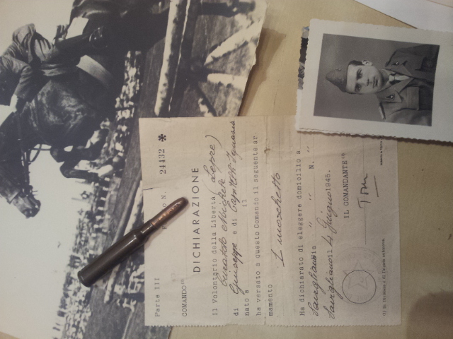 Nonostante la sua militanza nelle Brigate Garibaldi – Brigata Nannetti e poi Brigata Carando, papà non fu certamente comunista (da ufficiale, aveva giurato fedeltà al Re) ed era troppo intelligente e raffinato per essere fascista, credo invece che fosse sostanzialmente di sentimenti liberali. Sappiamo però che in quei giorni ai combattimenti parteciparono italiani di ogni convinzione politica e papà dovette trovare una collocazione adatta al suo status. La militanza partigiana durò dall’ ottobre 1944 al maggio 1945 e, stando ai documenti, non fu vissuta facendo sfilate e sventolando bandiere ma anche combattendo e rischiando. Verso la fine della guerra e subito dopo, papà restò militare e fedele al suo giuramento ed a poche amicizie maturate sotto le armi e provate in condizioni molto difficili.
