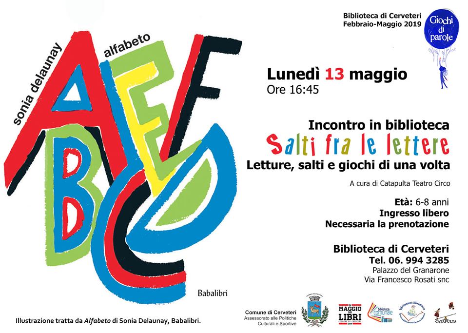 Lunedì 13 maggio alle ore 16.45 c’è “Salti fra le lettere”, nuova iniziativa ad ingresso gratuito rivolto ai piccoli di età compresa tra i 6 e gli 8 anni, tra giochi di parole e giochi di una volta. La prima parte dell’incontro è dedicata alla lettura ad alta voce di “Alfabeto” di Sonia Delaunay.