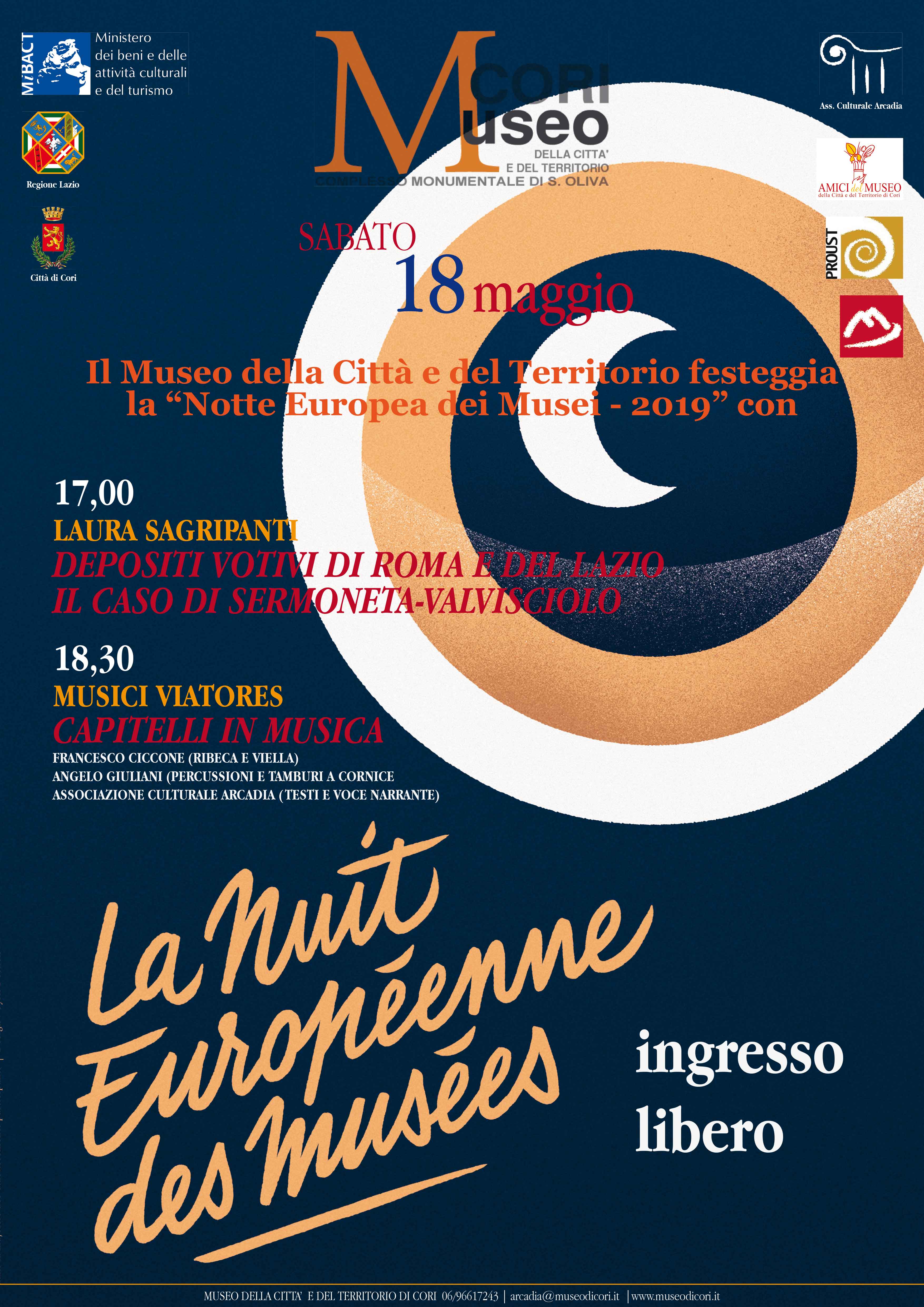 Come ogni anno il Museo della Città e del Territorio di Cori e l’associazione culturale Arcadia, con il patrocinio del comune di Cori, aderiscono alla Notte Europea dei Musei 2019, proponendo due appuntamenti nel tardo pomeriggio di sabato 18 maggio: alle ore 17:00 Laura Sagripanti terrà la conferenza dal titolo “Depositi votivi di Roma e del Lazio. Il caso di Sermoneta-Valvisciolo”.