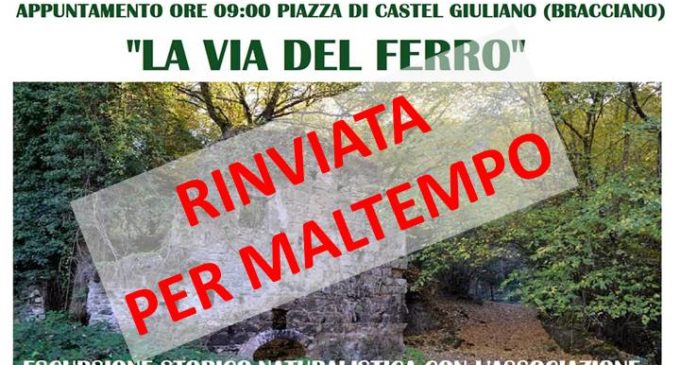 Si informa che l’escursione alle ferriere di Castel Giuliano / Bracciano, prevista per domani Domenica 19 Maggio, e’ stata rinviata causa maltempo di questi giorni e terreno pesante. Ci dispiace.
