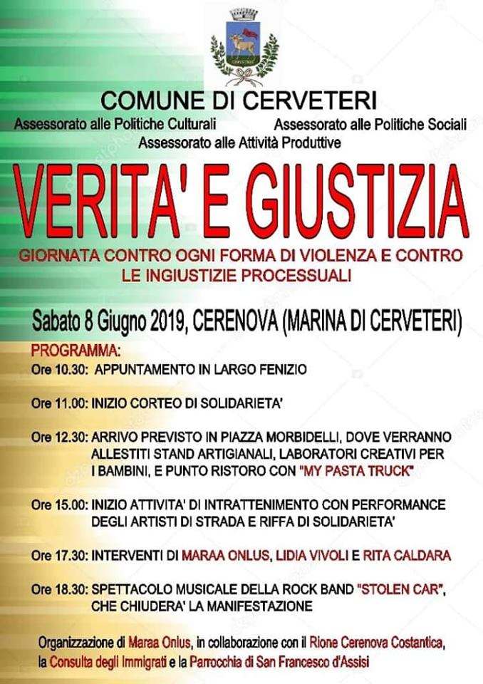 “Una giornata contro ogni forma di violenza, contro ogni forma di ingiustizia. Una giornata per le Donne, per tutte quelle Donne uccise, maltrattate, da chi diceva di amarle. Una giornata per chiedere per loro e per le loro famiglie verità e giustizia. Ad organizzarla è l’Associazione Maraa Onlus, da sempre impegnata al contrasto della violenza di genere, in collaborazione con il Rione Cerenova Costantica, la Consulta dei Migranti e la Parrocchia San Francesco d’Assisi. Un ricco programma tra musica, dibattiti e cortei solidali che avrà luogo a Marina di Cerveteri nella giornata di sabato 8 giugno”. Ad annunciare l’iniziativa, patrocinata dagli Assessorati alle Politiche Culturali, alle Politiche Sociali e alle Attività Produttive, è Alessio Pascucci, Sindaco di Cerveteri.