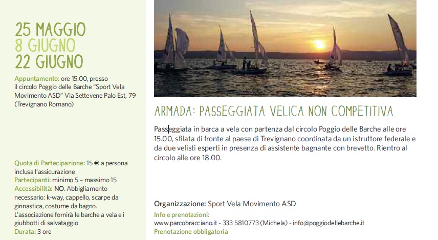 Passeggiata in barca a vela con partenza dal circolo Poggio delle Barche alle ore 15.00, sfilata di fronte al paese di Trevignano coordinata da un istruttore federale e da due velisti esperti in presenza di assistente bagnante con brevetto. Rientro al circolo alle ore 18.00.