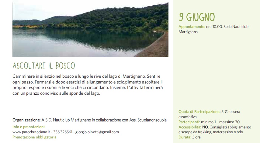 Camminare in silenzio nel bosco e lungo le rive del lago di Martignano. Sentire ogni passo. Fermarsi e dopo esercizi di allungamento e scioglimento ascoltare il proprio respiro e i suoni e le voci che ci circondano. Insieme. L’attività terminerà con un pranzo condiviso sulle sponde del lago.