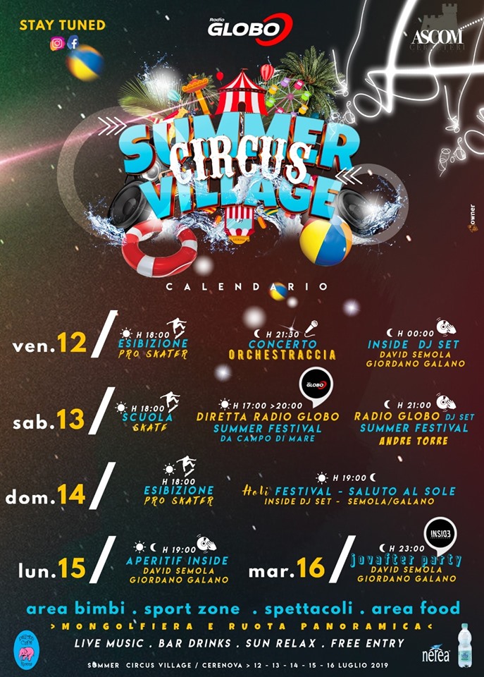 Scandirà le ore che separano la città dal grande concerto di Lorenzo Jovanotti, il Summer Circus Village, dal 12 luglio fino al giorno del concerto, cinque giorni di spettacoli, stand gastronomici, attrattive per bambini e famiglie promossi da ASCOM – Associazione Commercianti Cerveteri. Il Lungomare di Cerveteri si trasformerà dunque in una straordinaria arena spettacoli a due passi dal mare.