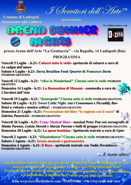 Per chi vorrà dedicarsi alla grande musica lirica, sempre il 13 luglio, presso il Polifunzionale, l’associazione Il Melodramma proporrà le arie più belle della tradizione lirica. Sempre al Polifunzionale, per tutto luglio, si terrà il Campus dell’Orchestra Freccia, aperto a tutti, con concerti quotidiani per chi ama la musica classica. Alla Grottaccia, a cura de “I Servitori dell’Arte”, tanto teatro, da non perdere il 14 luglio “La Buonanima di mammà” di Feydeau, tre serate di cinema, musica jazz il 6 luglio con il Davia Brasilian Funk Quartet), folk con il grande appuntamento del 20 luglio con la musica Folk irlandese dei Connemara e presentazioni di libri, in un’atmosfera suggestiva e di rara bellezza. A questi siti, dedicati alla Cultura e allo spettacolo, si aggiungeranno altre iniziative quali il mercatino estivo nei giardini pubblici N. Fedeli e la Fiera del Mare, dal 13 al 21 luglio, curata dall’Assessorato al Demanio. Una stagione intensa e piena di appuntamenti che si concluderà a settembre”.
