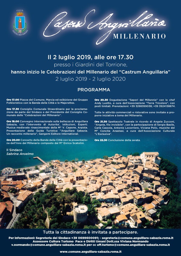 Nel contesto di riqualificazione di Anguillara Sabazia, non solo del centro storico, come dimostrano i “Cultural Point” appena collocati, ma di tutta la città, con la sua storia, la sua unità ed il suo senso di appartenenza, comune ad un passato glorioso, nasce l’idea, già espressa più volte dall’Assessorato alla Cultura con l’Amministrazione Comunale guidata dal Sindaco Sabrina Anselmo e condivisa da tutti, di celebrare un Millenario, con una serie di eventi, in cui si possa celebrare in sostanza la prima volta in cui Anguillara è stata citata come “Castrum”, con i suoi “milites” con informazioni preziose sulla comunità e sul diritto di pesca nel lago di Bracciano. Vi aspettiamo!