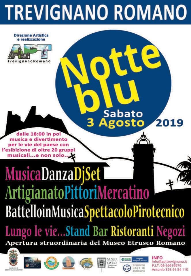 Il programma dell’evento e la piantina grafica delle iniziative sono disponibili presso il rinnovato Punto Informazioni Turistiche sito sulla Piazza centrale. “Questo appuntamento – afferma il Vicesindaco e Assessore al turismo Luca Galloni – cresciuto esponenzialmente negli anni con migliaia di presenze è certamente, insieme alla “notte bianca dello sport” e ai grandi festeggiamenti di ferragosto con la processione mariana sul lago, uno degli eventi più importanti della nostra programmazione di intrattenimento estivo per chi sceglie Trevignano come meta turistica o di svago. Grazie alla stretta collaborazione con l’Associazione di Promozione Turistica che ha ideato e organizza con grande professionalità la notte blu, anche quest’anno regaleremo tanti momenti magici, buona musica e divertimento per coloro che vorranno passare il loro tempo con noi, sulla nostra costa lacustre dipinta di blu”.