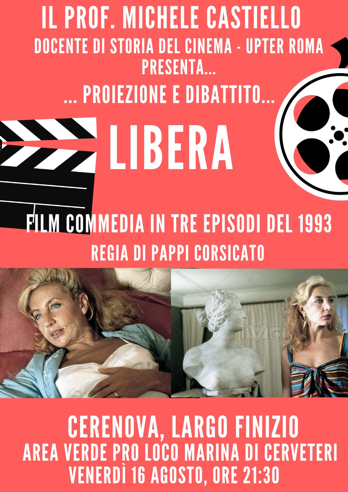 Venerdì 16 luglio alle ore 21:30, dopo il successo della serata del luglio scorso, il Professor Michele Castiello, Docente di Storia del Cinema UPTER – ROMA, promuove una serata ad ingresso gratuito con dibattito e proiezione del film “Libera”, film commedia in tre episodi del 1993 diretto dal regista napoletano Pappi Corsicato.